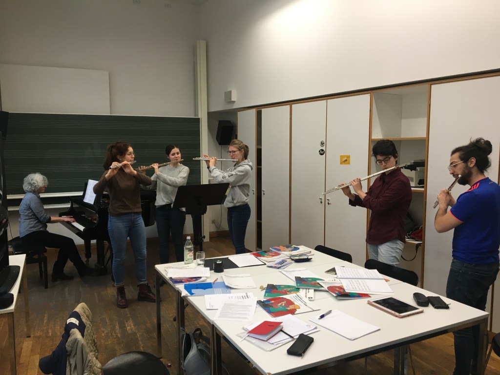 Workshop an der Hochschule für Musik und darstellende Kunst Frankfurt am Main für Studierende zum Thema Anfängerunterricht mit Jugendlichen und Erwachsenen mit der Schule „Querflöte spielen – mein schönstes Hobby“ (Schott) im Januar 2020.